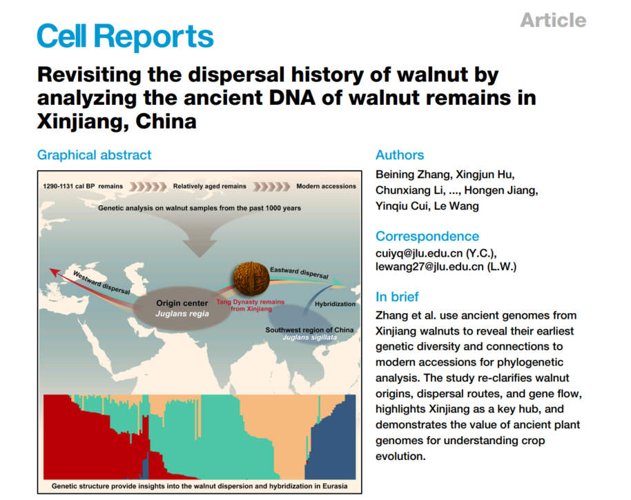 崔银秋教授与植物科学学院王乐副教授团队利用古DNA技术成功获取了世界首例古代核桃全基因组数据,并综合运用古基因组学与群体遗传学分析手段系统揭示了核桃(Juglans regia)在丝绸之路上的传播路径及遗传演化特征。该研究不仅填补了核桃古基因组数据的空白,更为揭示丝绸之路上关键经济作物的传播历史与驯化轨迹提供了直接的分子证据。该研究成果以“Revisiting the dispersal history of walnut by analyzing the ancient DNA of walnut remains in Xinjiang,China”为题,在国际权威学术期刊《Cell Reports》上发表。女优