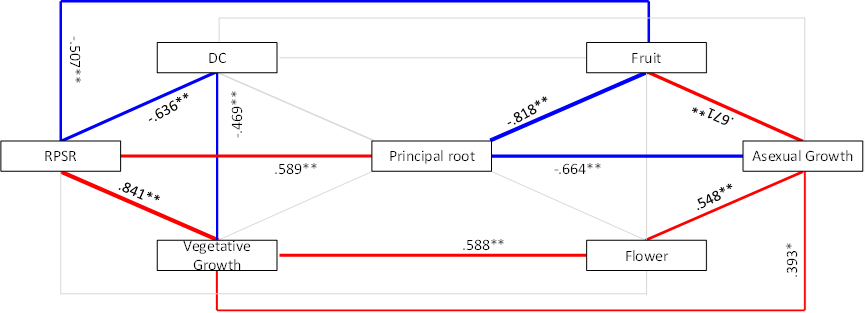 图3. 从相关性的角度而言,北乌头主根(Principal root)处于资源分配的中心位置