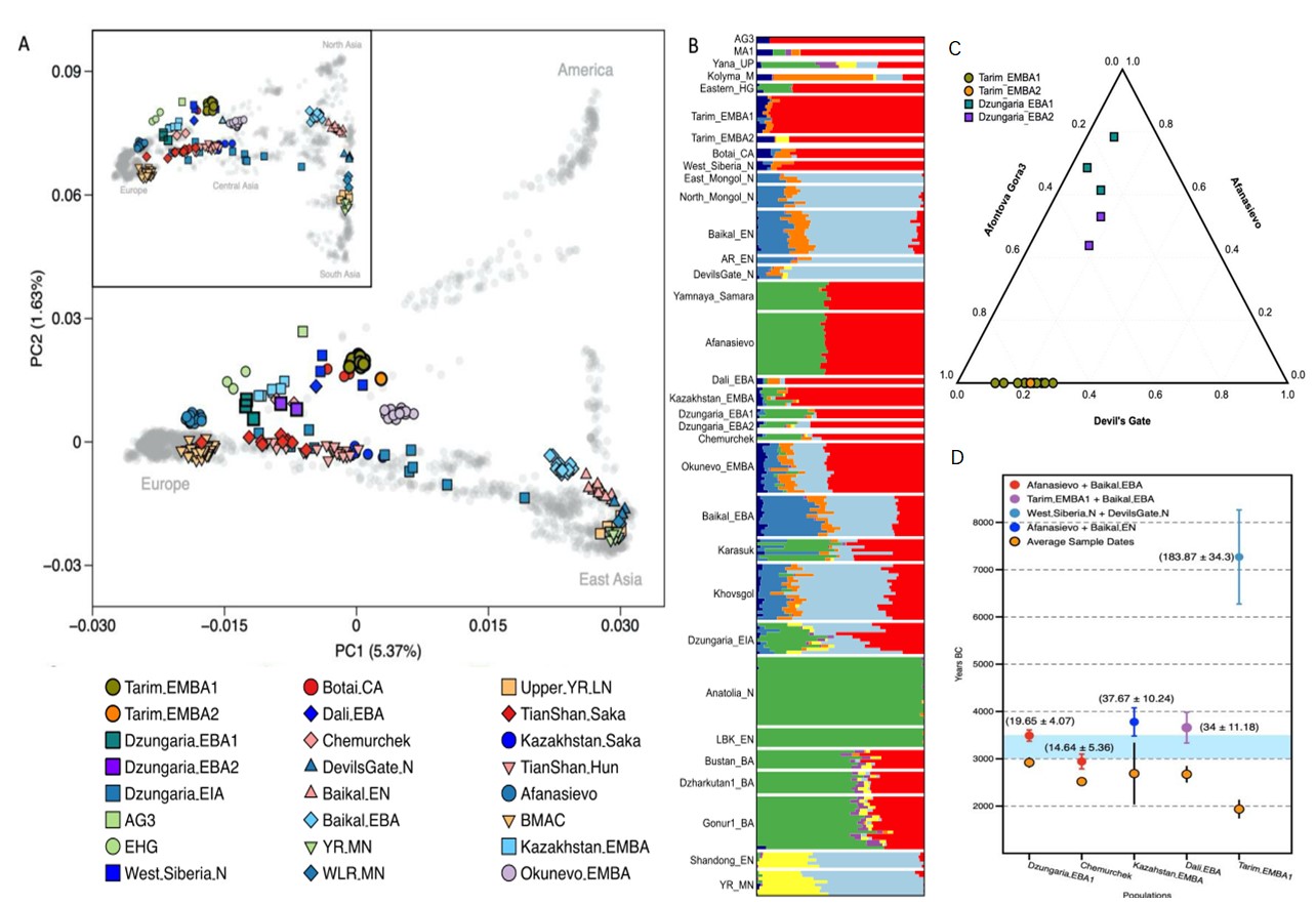 图2. 本研究中新疆青铜时代古代人群的遗传结构分析。其中A为古代个体的主成分分析结果(PCA);B为古代新疆个体和其他古代欧亚人的 ADMIXTURE 图(K=8); C.新疆青铜时代个体(Tarim_EMBA和Dzungaria_EBA)祖先来源的QpAdm分析;D.亚洲青铜时代人群的遗传混合时间分析,其中塔里木古代人群呈现出久远的混合时间。