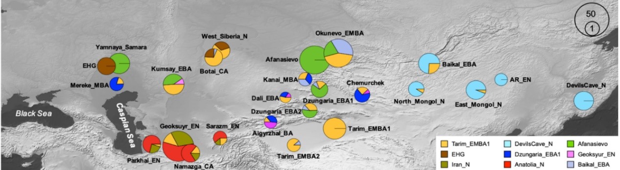 图3.欧亚大陆青铜时期以及青铜时期之前的古代人群种群历史(qpAdm)分析结果。