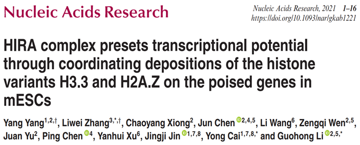 蔡勇教授团队与中国科学院生物物理研究所李国红研究员团队合作,利用基因编辑技术结合CUT&Tag-ChIP-Seq等基因组学分析方法,阐释了小鼠胚胎干细胞(mESC)中组蛋白变体H3.3和H2A.Z之间通过协同调节增强子和启动子调控区域的染色质动力学来启始基因转录的作用机制。相关研究结果以“HIRA complex presets transcriptional potential through coordinating depositions of the histone variants H3.3 and H2A.Z on the poised genes in mESCs”为题,2021年12月11日在线发表于Nucleic Acids Research。