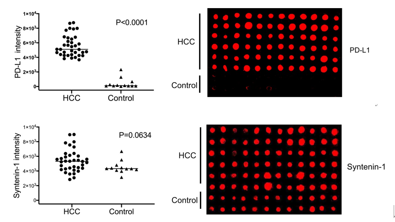 研究团队以36例肝癌患者和12例健康对照的血浆样本进行了外泌体的阵列捕获和原位免疫印迹检测。以程序性细胞死亡配体1(PD-L1)和外泌体标志蛋白Syntenin-1为例,仅用1 μL的血浆样品,即可实现外泌体蛋白质标志物的高灵敏度、高通量检测,所发展的分子探针为肿瘤的早期诊断提供了新的分子工具。