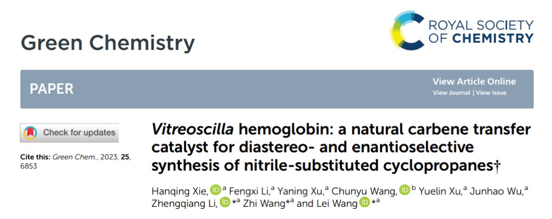 通过对血红蛋白结构和催化机制的进一步理解,课题组以血红蛋白具有的卡宾转移酶活力为基础,探索其在手性合成中的应用,结合分子对接技术多角度分析催化机制,以“Vitreoscilla hemoglobin: A natural carbene transfer catalyst for diastereo- and enantioselective synthesis of nitrile-substituted cyclopropanes”为题,在国际权威学术期刊《Green Chemistry》(影响因子9.8,中科院分区一区)在线发表研究论文。论文中报告了一种对环境友好的策略,将原位生成的重氮试剂与生物催化相结合,用于芳香烯烃的不对称环丙烷化。论文第一完成单位为女优
