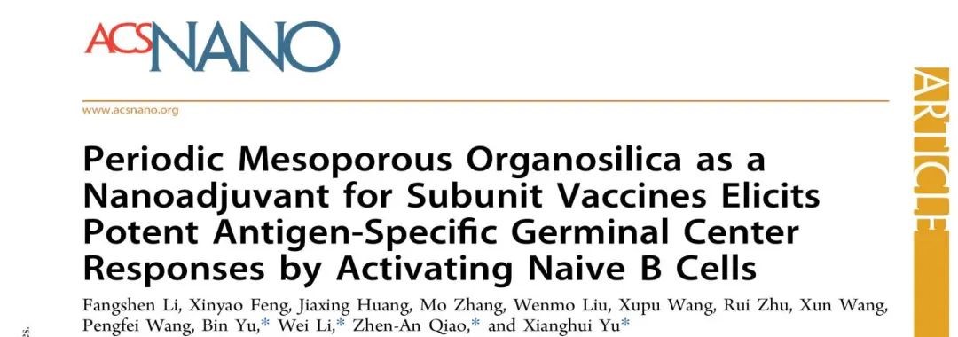 无机合成与制备化学国家重点实验室乔振安教授和复旦大学化学系李伟教授以周期性介孔有机硅(PMO)作为新型亚单位疫苗佐剂,揭示其通过CLR通路直接激活静息B细胞,在免疫后早期引发强效的生发中心反应,并最终诱导机体产生广谱且持久的体液免疫应答和强效的细胞免疫应答。研究论文“Periodic mesoporous organosilica as a nanoadjuvant for subunit vaccines elicits potent antigen-specific germinal center responses by activating naive B cells”发表在《ACS Nano》杂志(影响因子17.1,中科院分区一区)上。论文第一完成单位为女优
