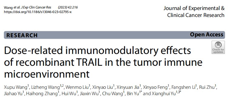 艾滋病疫苗国家工程实验室于湘晖、于彬团队报道了重组TRAIL在TME中扮演着剂量依赖的双向免疫调节作用,并详细阐释了作用机制。同时探讨了癌症治疗中重组TRAIL增强抗肿瘤免疫和抗肿瘤效应的潜在策略。研究论文“Dose-related immunomodulatory effects of recombinant TRAIL in the tumor immune microenvironment”发表在国际学术期刊《Journal of Experimental & Clinical Cancer Research》(影响因子11.3,中科院分区一区)上。论文第一完成单位为女优