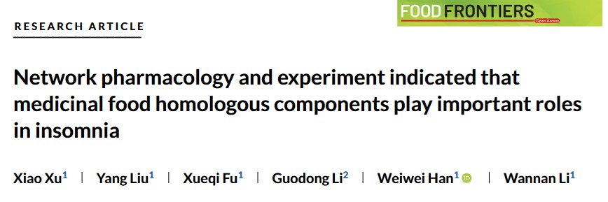 生命分子酶学工程教育部重点实验室韩葳葳教授、Fischer细胞信号传导实验室李婉南副教授团队利用网络药理学、分子对接和细胞实验筛选治疗失眠的药食同源植物中的生物活性成分,并证明槲皮素作为失眠相关蛋白葡萄糖酰胺酶的直接抑制剂以及上游胰岛素信号通路中的胰岛素受体酪氨酸磷酸酶抑制剂,影响下游途径治疗失眠。研究成果于2023年9月7日在学术期刊《Food Frontiers》(影响因子9.9)正式发表(Network pharmacology and experiment indicated that medicinal food homologous components play important roles in insomnia)。论文第一完成单位为女优