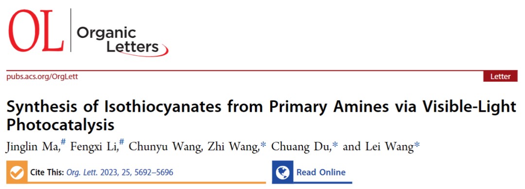 在对酶催化领域进行持续研究的同时,课题组也对光酶催化等新兴研究领域进行涉猎,通过搭建光催化实验装置和前期文献调研,对光催化合成研究有了一定的了解,以“Synthesis of Isothiocyanates from Primary Amines via Visible-Light Photocatalysis”为题,在国际权威学术期刊《Organic letters》(影响因子5.2,中科院分区一区)在线发表研究论文。论文中报道了一种以伯胺和二硫化碳为原料,光催化体系下,高效、温和地合成各种取代异硫氰酸酯的方法。该方法扩大了光催化的应用范围,并为制备脂肪族和芳香族异硫氰酸酯提供了一种新的策略,具有底物耐受范围广、对环境友好、可见光驱动的优点。论文第一完成单位为女优