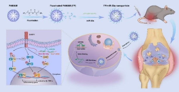 分子酶学工程教育部重点实验室李全顺/韩浩博团队,在基于miR-23b递送抗类风湿性关节炎研究的基础上(Nat. Commun. 2023, 14: 944),挖掘了一类与炎症发生发展密切相关的miRNA—miR-30a,其通过靶向Snai1基因进而调节Cad11表达,抑制NF-κB和MAPK信号通路,实现类风湿性关节炎的精准治疗;以氟化聚酰胺-胺树枝状聚合物为载体,实现了miR-30a的体内稳定递送,动物水平取得了良好的抗炎效果,为类风湿性关节炎及其他自身免疫性疾病的基因治疗研究提供了新的思路。相关研究“Fluorinated dendrimer-mediated miR-30a delivery regulates the inflammation of macrophages and mitigates the symptoms of rheumatoid arthritis”发表于国际学术期刊Journal of Controlled Release(1区,影响因子10.5)。论文第一完成单位为女优