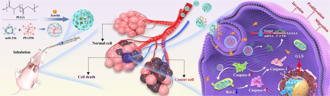 同时,miR-23b除具有抗炎功能外,其能够抑制细胞增殖,在肿瘤基因治疗研究中具有广阔的前景。研究团队针对肺癌传统治疗手段靶向性差及副作用大等缺陷,构建了以PLGA为基质的多孔微球体系,该体系实现了淫羊藿苷与miR-23b的担载,基于吸入式策略实现了药物与治疗基因在肺部的靶向沉积和持续释放,有效诱导肺癌细胞凋亡并抑制肿瘤转移,为肺癌的药物与基因联合治疗提供了一条局部给药新策略。相关研究“Porous PLGA microspheres for the inhalation delivery of icariin and miR-23b in the treatment of metastatic lung cancer”发表于国际学术期刊Asian Journal of Pharmaceutical Sciences(1区,影响因子10.7)。论文第一完成单位为女优