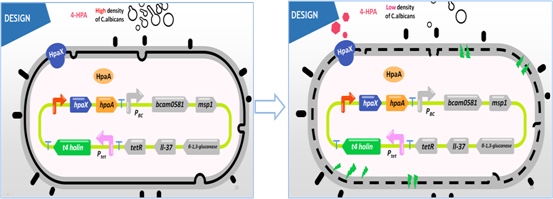 该治疗系统工作原理如图所示:当环境中白色念珠菌增加时,其特异性分泌的4-HPA经转运体(HpaX)导入工程菌内,与转录因子(HpaA)结合形成复合物,激活PBC启动子,启动下游基因的表达包括抑制相转变的BDSF、降解菌丝的Msp1、降解生物膜的β-1,3-葡聚糖酶和杀死白色念珠菌的抗菌肽LL37。当环境中白色念珠菌因治疗导致数量降低时,出于生物安全和治疗效果的考虑,采用Tet-Off系统、以T4 holin为内毒素开启工程菌自杀,以维持阴道菌群的相对稳定。这种生物感应的治疗系统与传统治疗手段相比优势显著,安全、长效、不会导致耐药,具有潜在的应用价值。
