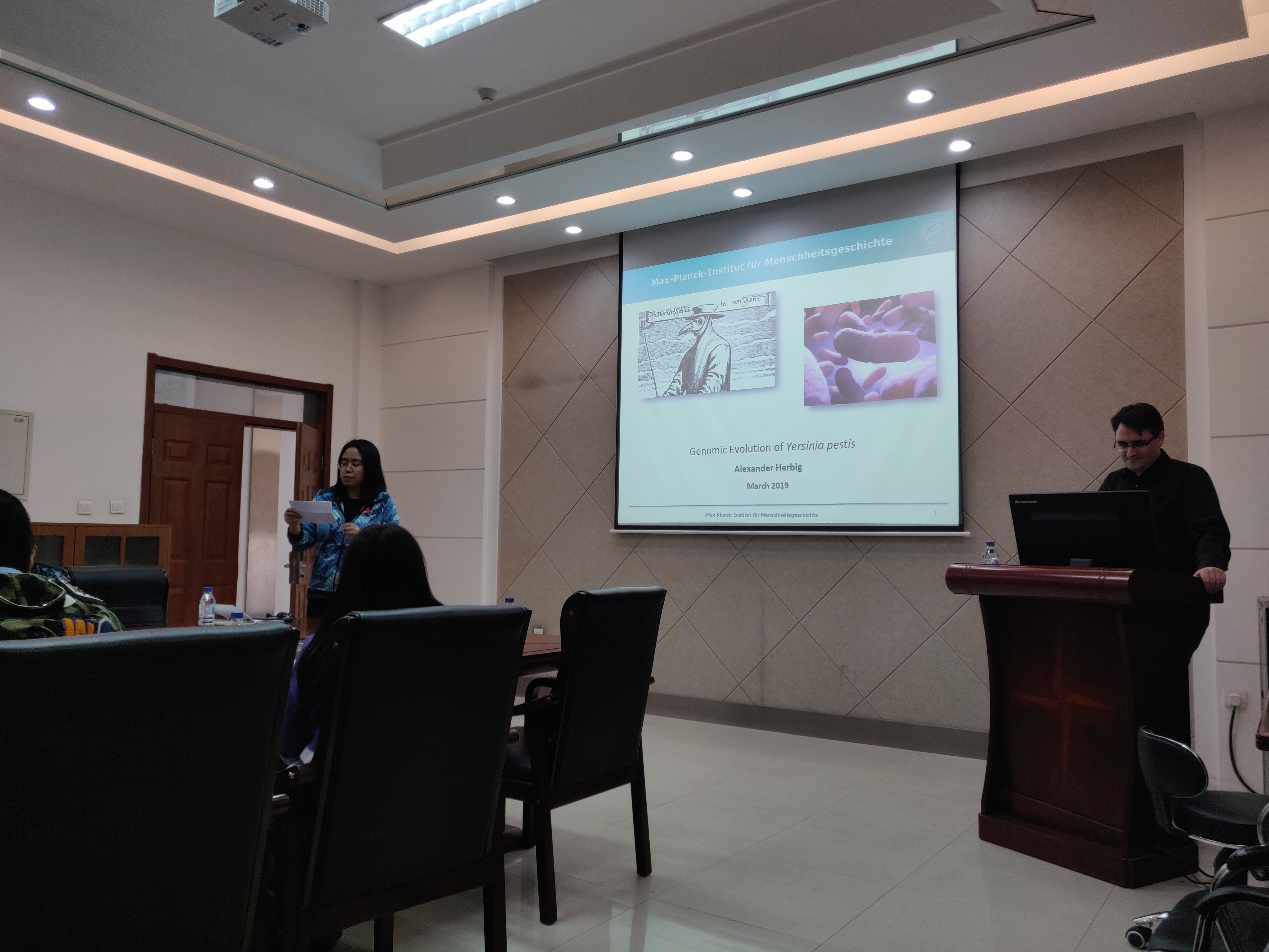 报告的名称为:鼠疫耶尔森菌基因组的进化(Genomic Evolution of Yersinia pestis),报告内容涵盖目前古DNA研究的最新技术、目标序列的捕获富集、系统发育树的构建等领域,同时,Herbig博士用简洁易懂的语言向听众展示了DNA序列比对、SNP位点获取、质量控制等生物信息学技术的基本原理与大致流程,根据不同时代、不同地域的系统发育树推断了鼠疫耶尔森菌在亚欧大陆的传播历史,展示了该致病菌的几个古老祖先。最后,Herbig博士还向大家展示了鼠疫耶尔森菌的线粒体基因组致病因素的heatmap图,并根据不同种类的古菌基因座的比对推测鼠疫传播方式和途径。讲座过后,不少师生就报告内容向Herbig博士提出疑问,Herbig博士一一作出了解答。