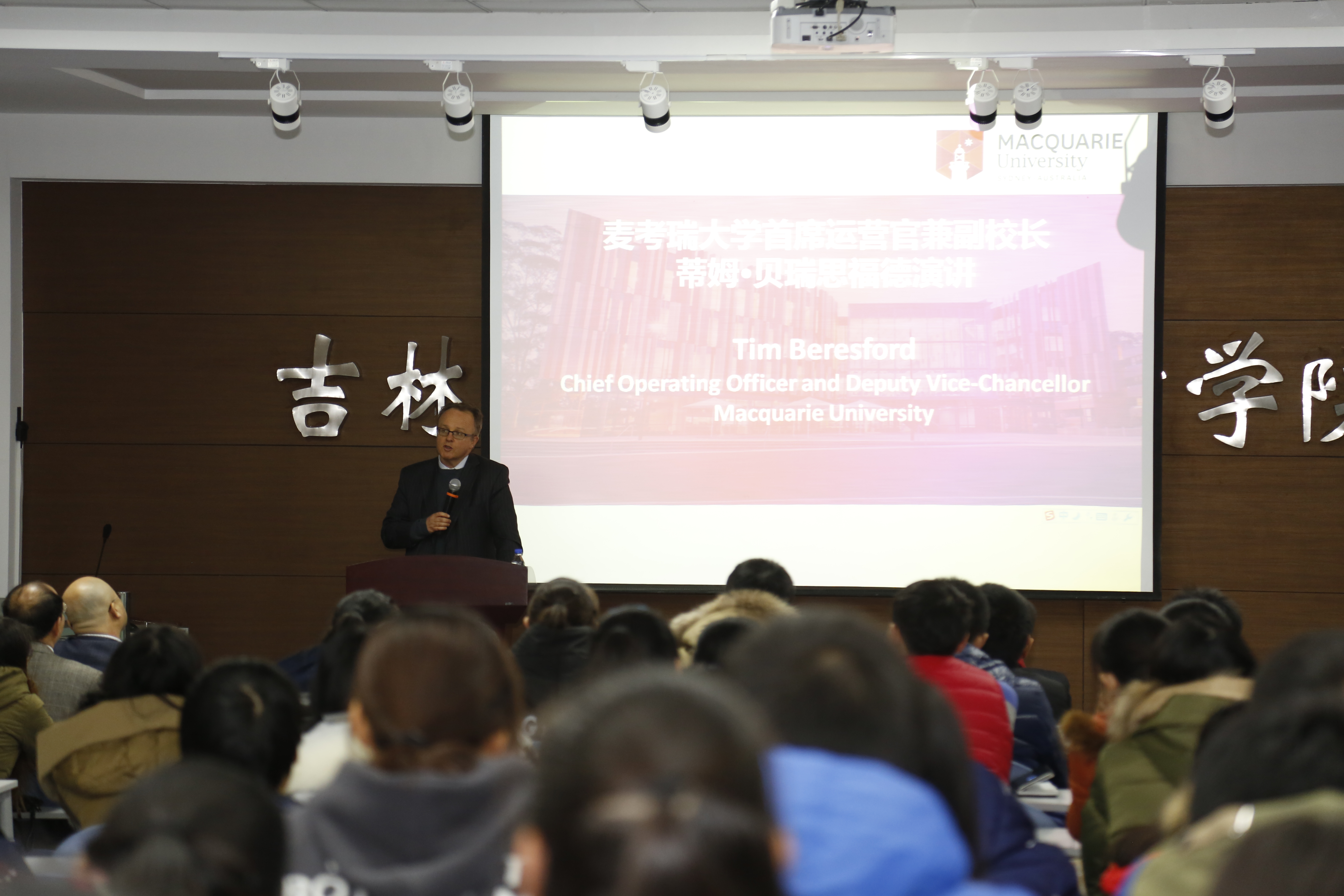 报告厅做了精彩的报告。蒂姆·贝瑞斯福德是麦考瑞大学首席运营官兼副校长,负责全面监管学校工作,包括国际学生的招生、财务管理、人力资源等。学校国际合作与交流处副处长部铁军、女优
