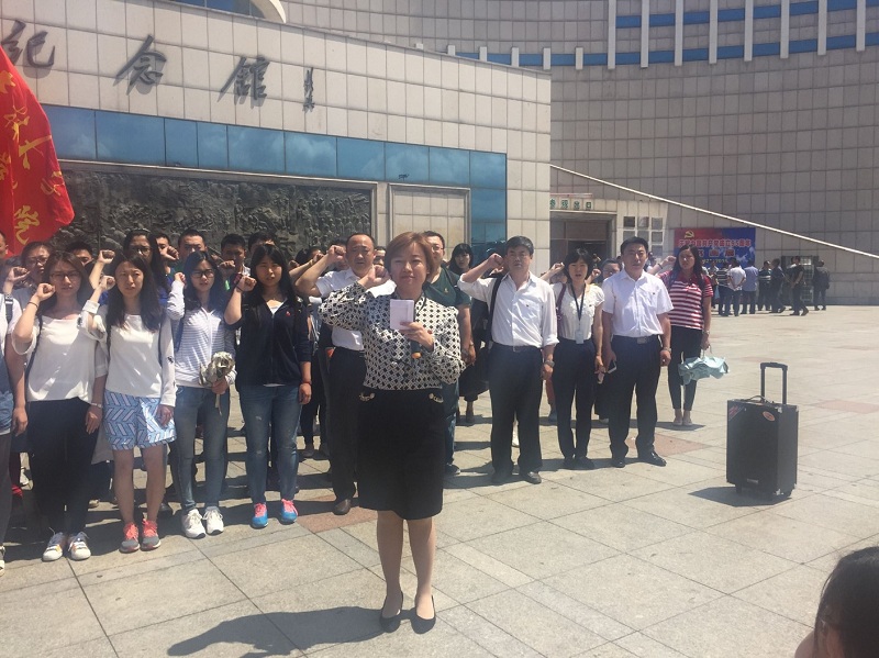随后,学院师生党员们在纪念馆门前举行了建党95周年纪念仪式。仪式由赵国安副书记主持。伴随着激昂的国歌声,活动拉开帷幕。在刘丽慧副书记的带领下,师生党员举起右拳,面对鲜红的党旗庄严宣誓。学生新党员代表岳美廷同学对党组织的关心、培养和教育表示衷心的感谢,并承诺必将不辱党和国家赋予的使命,铭记历史、锐意进取,为建设中国特色社会主义社会贡献自己的力量。