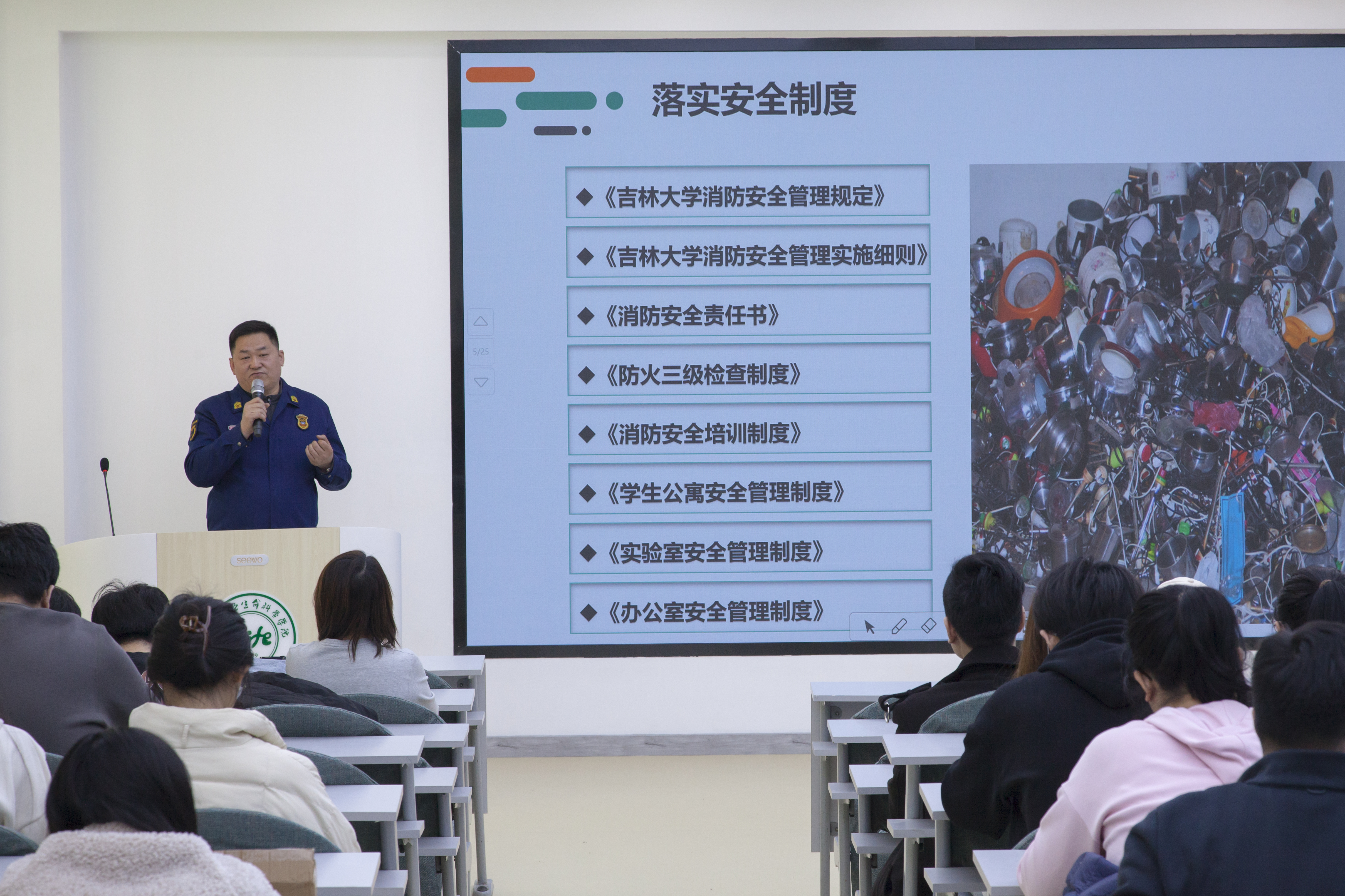 “如何辨识身边的火灾隐患?如何正确使用灭火器?如何扑救初期火灾?”讲座中,董立明讲述了近年来典型火灾案例,通过观看警示教育宣传,直观展现了火灾的危害。系统讲解了火灾发生的三要素和发展的四个阶段,并展示了常见的消防设施及其使用方式,教育引导师生在提高消防安全知识的同时提升自防自救能力。还结合高校火灾案例和消防工作实践,重点剖析了校园中可能存在的火灾隐患,阐述了校园安全用电防火注意事项,并针对火灾特点传授了应对和自救逃生技能。