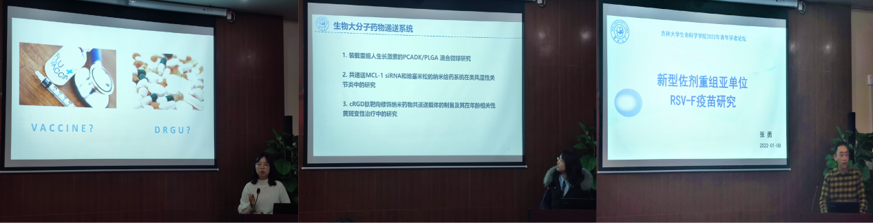 王烨副教授作题为“计算机辅助药物设计在甲型流感病毒药物研究中的应用”的主题报告,提出利用计算机辅助药物设计方法以甲型流感病毒关键酶为靶点,从小分子数据库中虚拟筛选甲型流感病毒的药物,从而为抗流感药物研发工作提高了效率,减少经费支出,并加快药物开发周期。孙凤英副教授作题为“生物大分子药物递送系统和NIR响应性递药系统的研究”的主题报告,报告阐明生物大分子药物在重大疾病治疗中已取得重大进展,但在体内递送方面仍然存在诸多亟待解决的难题和障碍,课题组合成一种生物友好型材料聚缩酮,构建了蛋白和核酸药物高效递送系统用于治疗类风湿性关节炎,年龄相关性黄斑变性等疾病。梁彦龙副教授作题为“人参发根培养及皂苷合成代谢人参发根培养及皂苷合成代谢”的主题报告,提出人参发根是发根农杆菌侵染人参创伤组织诱导而成的分化体系,是最具潜力的人参皂苷工业化生产介体之一,并汇报了人参发根方面已做的研究和拟进行的人参发根皂苷促分泌研究的内容和方案。苏维恒副教授作题为“化合物ABMA广谱抑制呼吸道病毒感染的作用和机制研究”的主题报告,汇报了广谱抑制流感病毒和新冠病毒感染的化合物及其作用机制,该工作提供了一种抗病毒先导化合物的候选。吴慧副教授作题为“磷酸化Tau在神经元死亡的作用和机制研究”的主题报告,研究证实了pTau通过激活RIPK1-RIPK3-MLKL轴和NF-κB信号通路诱导神经元发生程序性坏死和自发性神经炎症,并且发现以程序性坏死为靶点能够有效治疗TauP301S转基因鼠的认知障碍和行为损伤。赵莉副教授作题为“天然无序蛋白结构与功能的计算模拟研究”的主题报告,提出基于计算机模拟方法,聚焦天然无序蛋白结构与功能的关系,为深入理解相关疾病的致病机理与防控技术提供支持。张勇副教授作题为“新型佐剂重组亚单位RSV-F疫苗研究”的主题报告,该研究对呼吸道合胞病毒RSV疫苗的研究开发提供了新的思路。