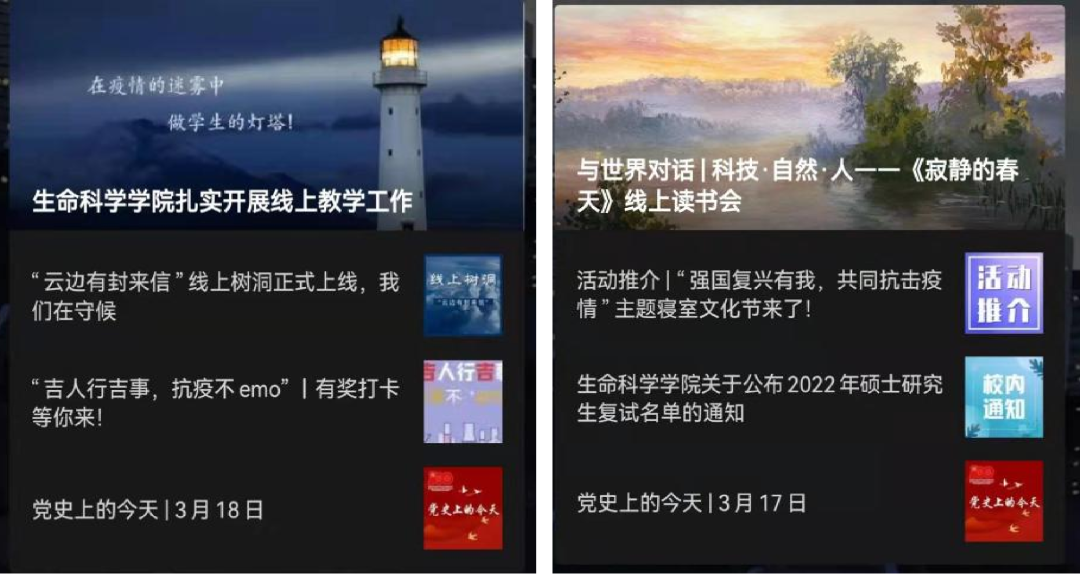 学院公众号在疫情封闭期间日更推文3-4篇,内容丰富,涵盖广泛,为师生提供一线抗疫资讯,发布抗击疫情主题正能量网络作品,持续加强网络思政阵地建设。