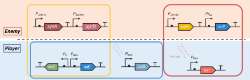 2020年,Jilin_China的参赛题目为“iGAME”,一款以合成生物学为基础设计的小游戏。在游戏中玩家通过不同颜色的光来控制“Player”和“Enemy”进行对抗,“Enemy”持续进行攻击(黄框所示),蓝光照射后“Player”开始防御(蓝框所示),红光照射后“Player”开始反击(红框所示),最终通过KNN算法计算菌的数目判别胜负。“iGAME”模拟了一种简单的竞争关系,其对丰富和发展菌落间相互作用的研究具有一定意义,同时也给模拟群落的时空演化提供了新的思路。“iGAME”为一款模拟生命系统的游戏,该项目的实施展示了合成生物学在开发基于生命系统的游戏方面的潜力。