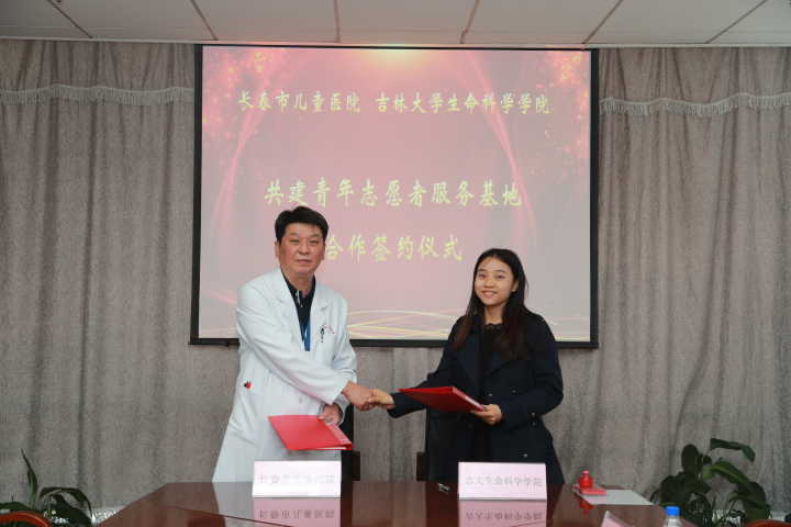 共建青年志愿者服务基地协议书”。吉林省儿童医疗中心、长春市儿童医院院长兼党委书记姜洪波、护理部主任张朋、门诊办主任魏志刚、社工部主任谭璐作为儿童医院代表,女优