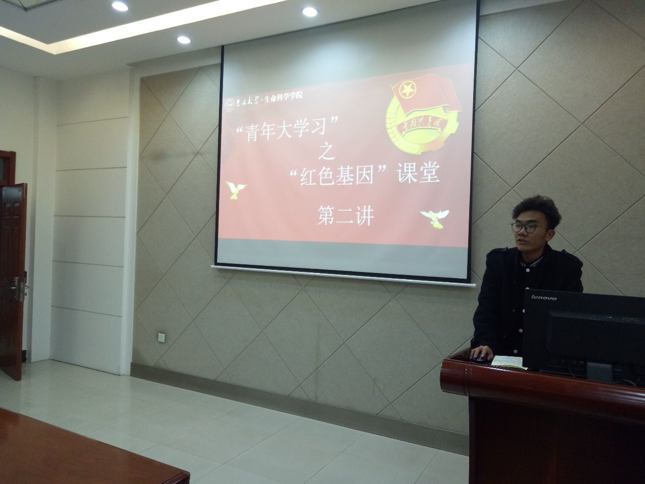 团学组织在生命科学楼335会议室开展了青年大学习之“红色基因”课堂第二讲,由院学生会主席丁是卯担任主讲人,女优