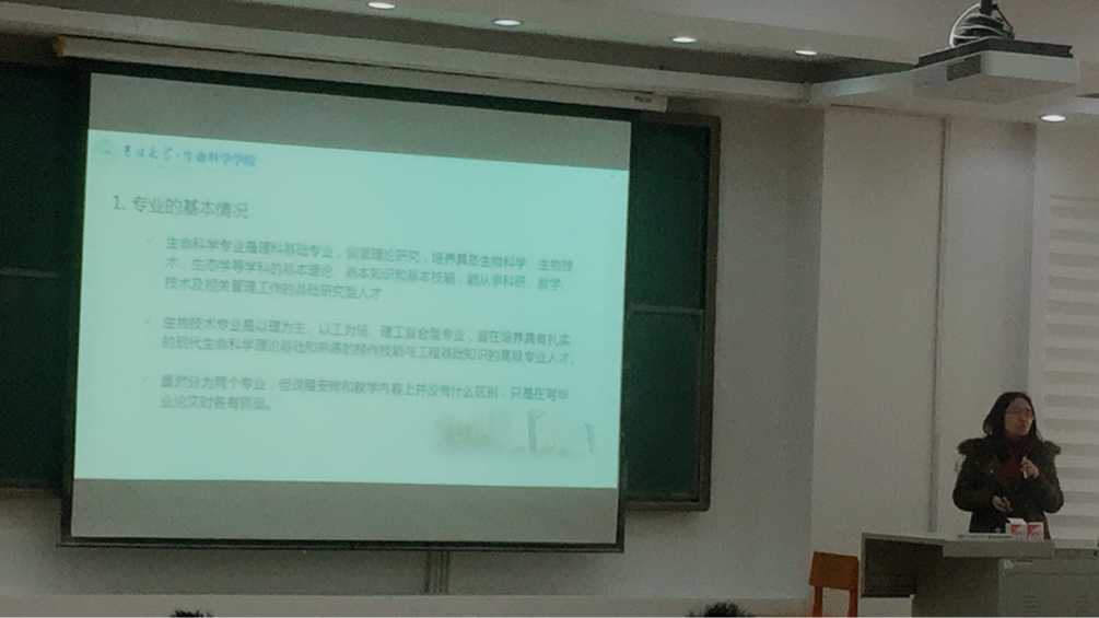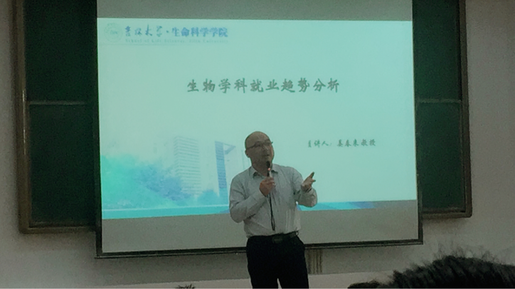 目前的主要科研方向和科研成果,同时结合两个专业学生学习和发展方向提出了若干建议;姜春来教授做了题为《生物学科就业趋势分析》的报告,幽默风趣的向同学们讲解了生物学科就业去向和本科阶段学习的注意事项。最后,各位老师针对学生的现场提问进行了详细的解答。