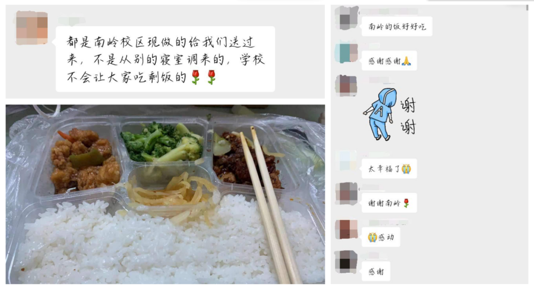 由于不可抗力,学校紧缺两万份晚餐,虽然加急制作,但通知表里南四的晚餐还是变成了牛奶和面包,并且不知何时才到。感受到院里同学们的心情,或许是有失落夹杂其中的,但最后仍是尽数化为了理解。所以当打开门后看到精致的饭菜,心中除了讶异,更是难以言说的感动。原来是校领导、老师和辅导员积极联络,南岭校区的食堂为我们迅速准备了盒饭,让每一位同学都吃上热乎的晚餐。群里接连不断的感谢,导员与书记的问候与关心,这一顿晚餐,想必会永远留在同学们心中。