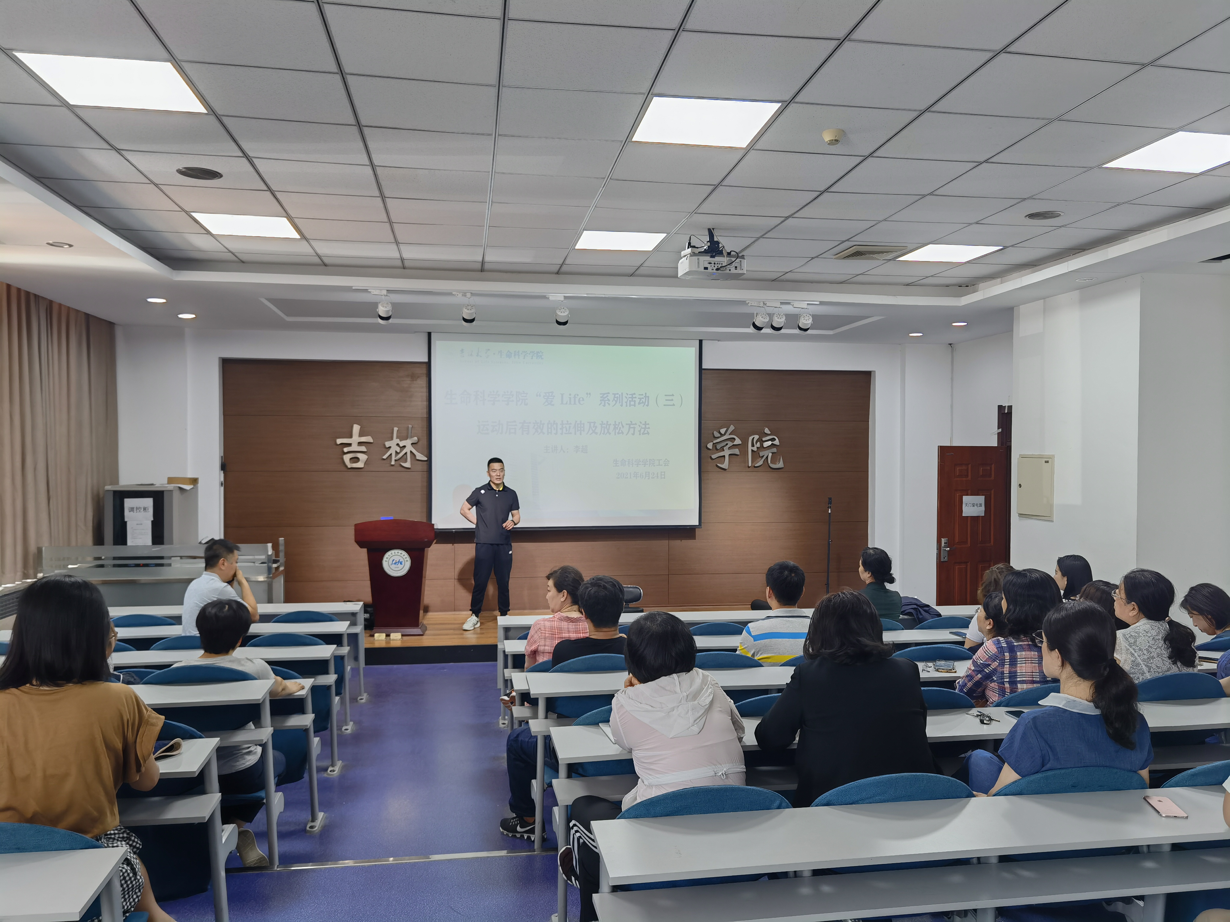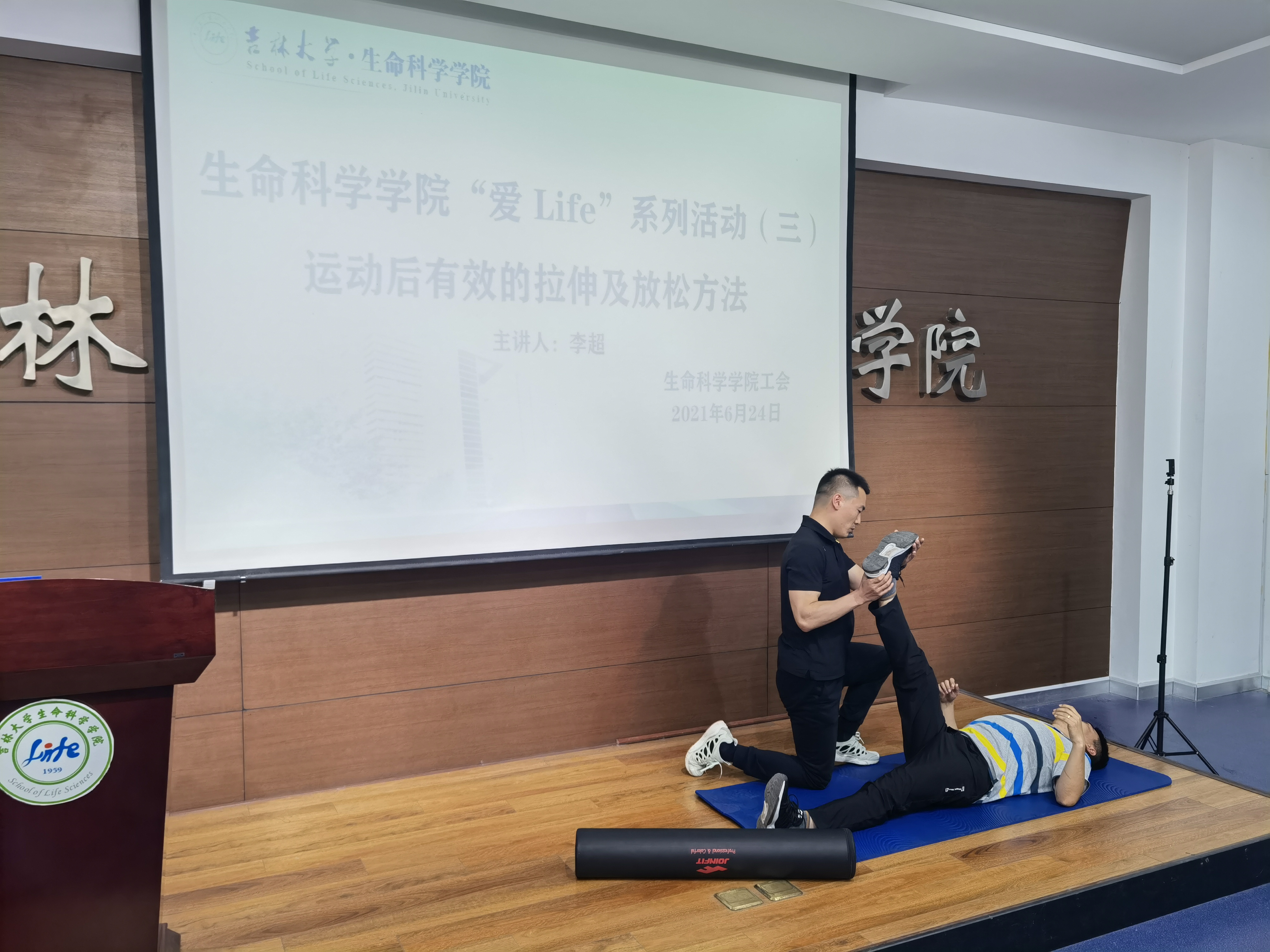 624日组织开展“爱Life”系列活动第三场—运动后有效的拉伸及放松方法。本次活动邀请从事训练修复10余年的李超教练,在生命科学楼107室,为学院教职工分享拉伸常识,活动现场李超教练结合老师提出的具体问题,现场示范,让老师们更加直观的体验到拉伸对于身体健康的重要作用。