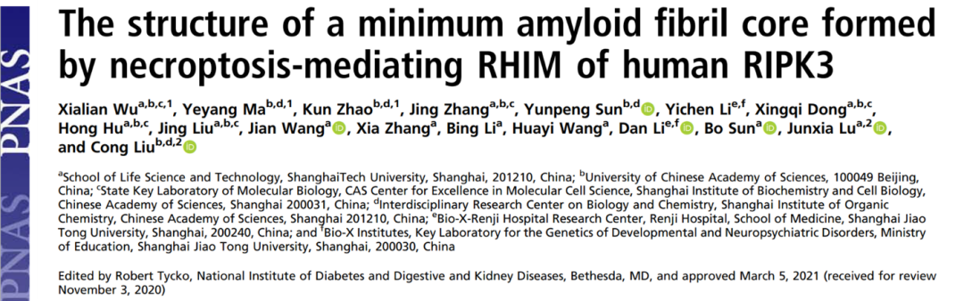 综上,该研究通过结合不同生物物理学手段研究了RIPK3通过液-固相转化形成功能性淀粉样纤维的结构基础,展示了功能性淀粉样纤维与病理性纤维的区别,并进一步讨论了这种具有特殊结构的功能性纤维在RIPK3介导细胞程序性坏死信号传导中的生物学意义。相关工作为进一步探索细胞内参与不同生理过程的功能淀粉样纤维聚集体的结构与功能奠定了基础。