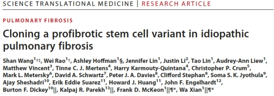 校友、浙江大学医学院附属口腔医院百人计划研究员王杉等人在Science Translational Medicine发表了最新研究:Cloning a profibrotic stem cell variant in idiopathic pulmonary fibrosis。研究鉴定了在特发性肺纤维化进程中关键的促纤维化干细胞,并针对其开发靶向特异性治疗药物。